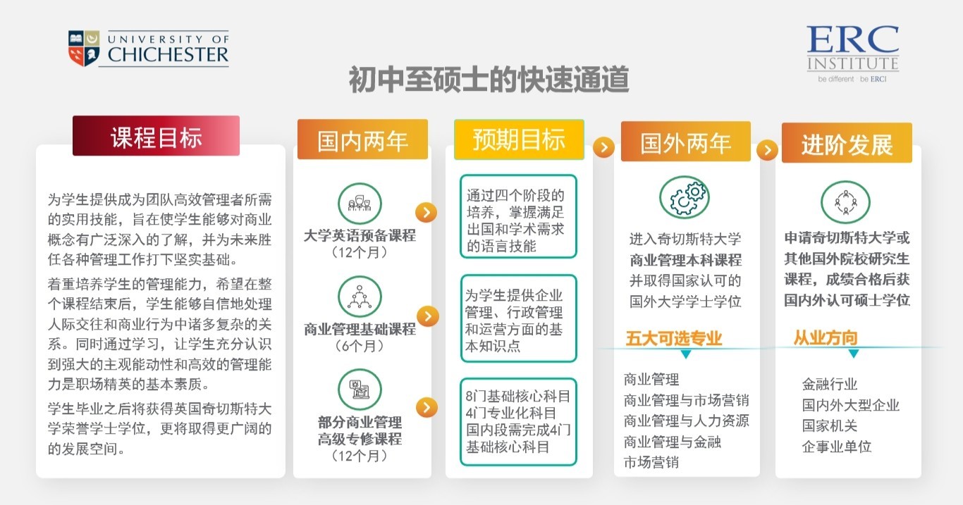 进入英国奇切斯特大学商业管理本科课程并取得国家认可的国外大学学士学位。